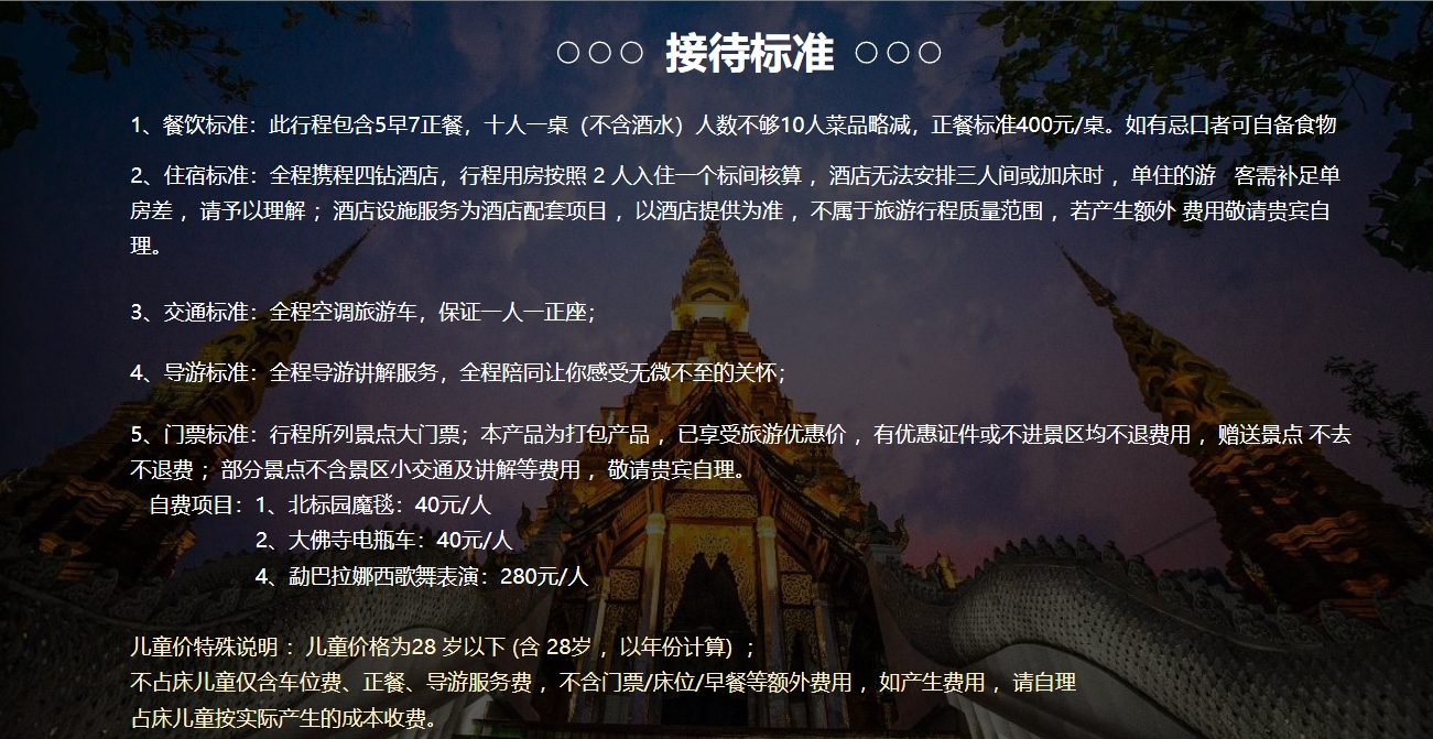 | 第4天 | 翡翠民俗文化館—乳膠展示中心—勐泐大佛寺—勐巴拉娜西歌舞表演(自費) ●早餐後參觀【翡翠民俗文化館】了解當地民俗文化。了解玉石翡翠等當地特產文化,在這裡您可以領略並鑑賞中緬百年之爭的「玉石之王」。 ●享用午餐。 ●參觀【乳膠展示中心】了解乳膠工藝和文化。 ●遊覽昔日的傣族王朝皇家寺院【勐泐大佛寺】(不含電瓶車40元/人)佛寺依山而建,高差達千米,呈坐佛形,為國內外所獨有。俯瞰整個西雙版納州府,旖旎的熱帶風光盡收眼底,同時還可觀賞:孔雀放飛盛景、參加潑水狂歡活動。 ●晚上推薦自費觀賞【勐巴拉娜西歌舞表演】(280元/人費用自理)是一台以版納民族風情為題材的大型旅遊歌舞晚會。後入住指定備選飯店休息。 ![]() |